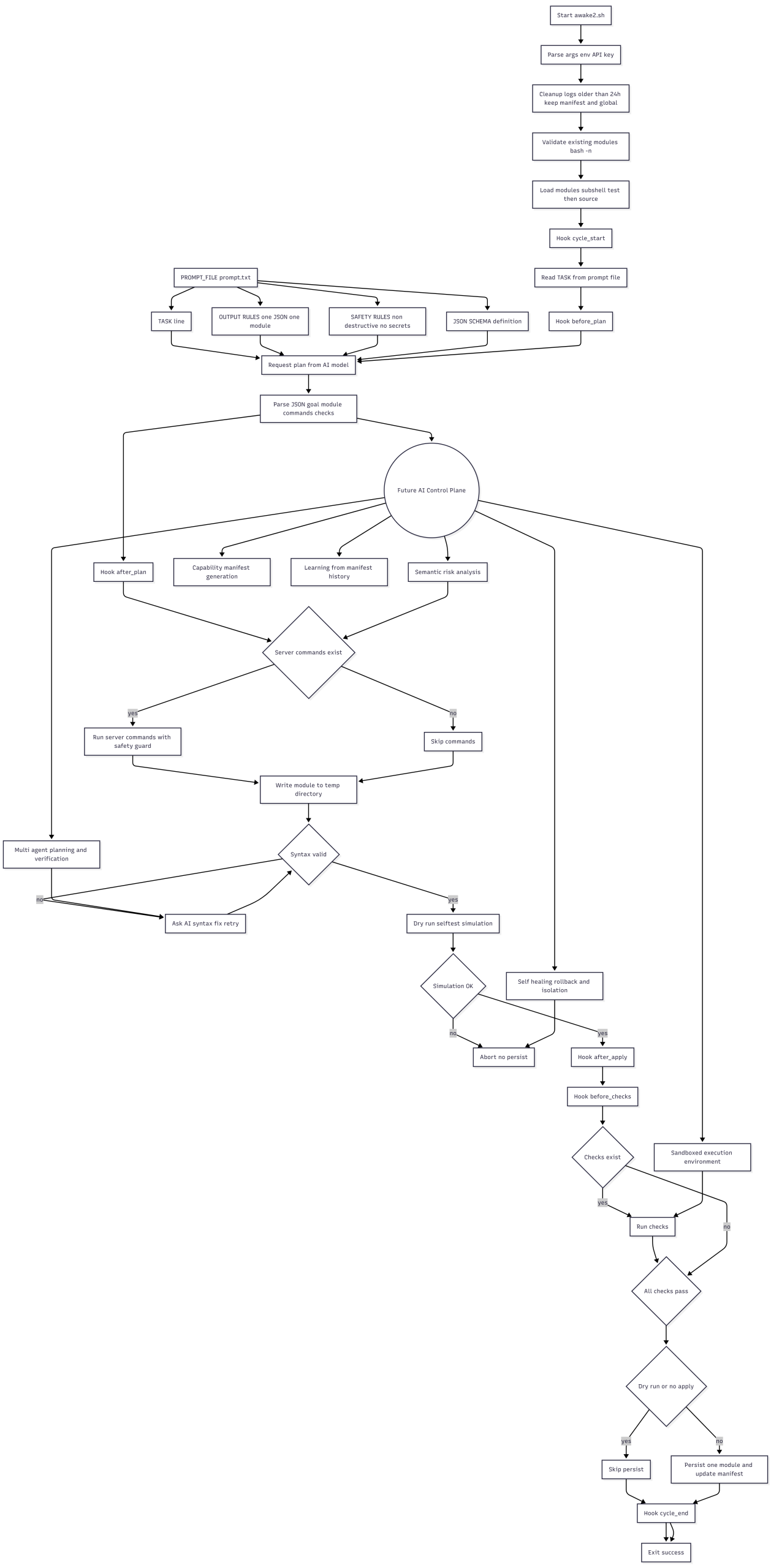 This paper positions AWAKE outside the paradigm of Artificial General Intelligence and autonomous agents. Rather than pursuing intelligence, goal formation, or world modeling, AWAKE exemplifies a constrained evolutionary software system whose behavior is fully governed by a human-defined prompt, strict validation rules, and an immutable execution core. The work is intended for researchers and practitioners interested in safe autonomy, long-lived infrastructure, and the design of systems that can adapt over time without sacrificing predictability, auditability, or human oversight.